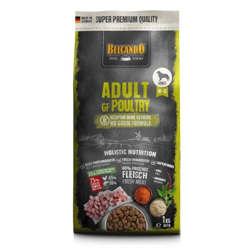 Στο προϊόν αυτό, τα σιτηρά έχουν αντικατασταθεί από τον πολύ υψηλής διατροφικής αξίας Αμάραντο (Super food). Σε συνδυασμό με την γαρίδα Κριλ, μια πολύτιμη πηγή ζωτικών ουσιών όπως τα Ω3 λιπαρά οξέα, αποδίδει μια ιδιαίτερα ισορροπημένη συνταγή. Με ελεγχόμενες πρωτεΐνες και λιπαρά, η BELCANDO® Adult GF Poultry είναι κατάλληλη για τις ανάγκες σκύλων με κανονική δραστηριότητα.